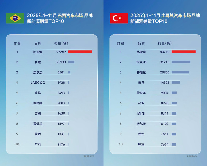 单说11月,巴西、土耳其、意大利这些国度的新动力汽车阛阓,比亚迪齐径直登顶;在新加坡更强横,拿下了全品牌销量第一。何况1到11月的累计销量里,比亚迪在巴西、西班牙等国的新动力品牌中如故榜首,新加坡和中国香港地区也齐是全品牌销冠,相当受当地猝然者认同。