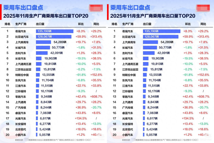 给寰宇说个奋斗的音书,泰斗数据泄漏,比亚迪本年11月的乘用车出口量太能打了,径直冲到12.8万台,跟旧年同时比,增长了313.4%,翻了好几倍!