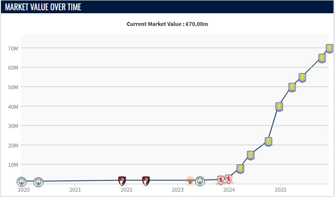 直播吧12月10日讯英超身价昨日进行了一次更新,阿斯顿维拉的中前场大中枢摩根·罗杰斯身价涨至7000万欧。他加盟维拉之后,身价也曾八连涨,从280万沿途飙升到7000万。